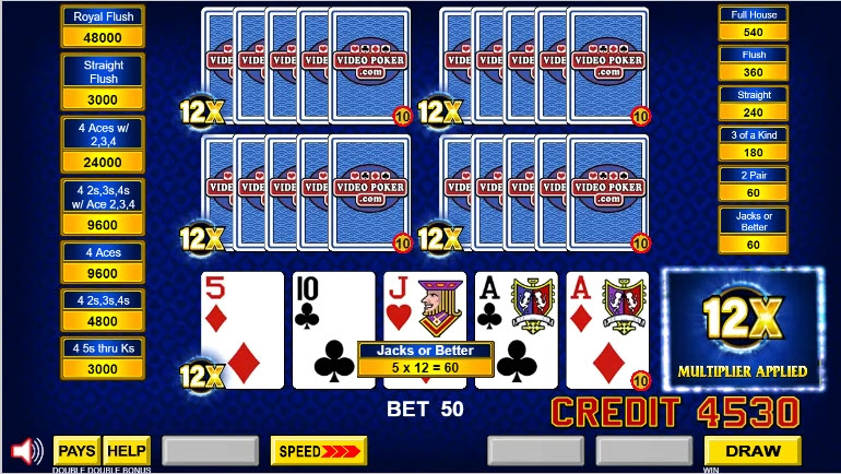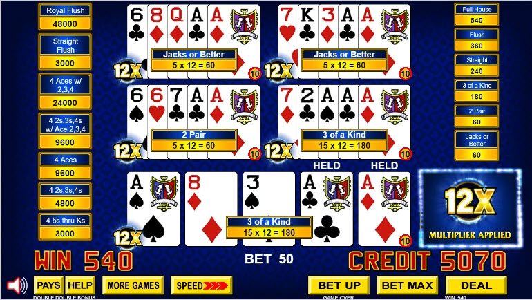 我的一對A在抽牌時變成了兩對高牌(每張賠付5),一對兩對(每張賠付5),以及兩張三條(每張賠付15)。依照12倍的倍數,我的贏利是12×(2×5 + 5 + 2×15) = 12×45 = 540。
