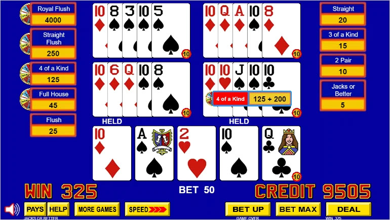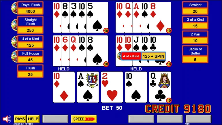 對於百搭牌遊戲,玩家必須拿到看起來像自然葫蘆或更好的牌。例如,在 Deuces Wild 中,QQQ22 有資格獲得獎勵,但 QQ882 則不符合資格。在 Joker Wild 中,玩家必須拿到自然卡才能獲得獎勵旋轉。