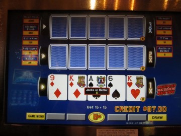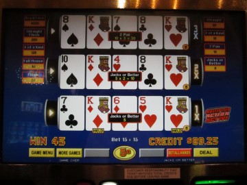 在抽牌中,我拿到了頂手牌,也就是兩對,在我玩的遊戲中賠率為2倍。加上3倍乘數和5個硬幣的下注,頂手牌的贏利是3 × 2 × 5 = 30。