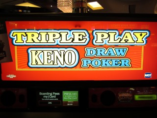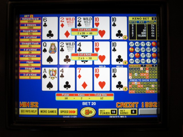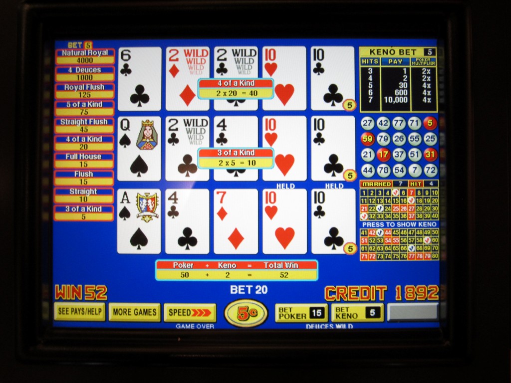 在上面的遊戲中,我總共下注了20個積分:視訊撲克15個,基諾5個。我之前選了七個基諾號碼。其中四個中獎,立即獲得兩個積分,以及2倍的視訊撲克乘數。