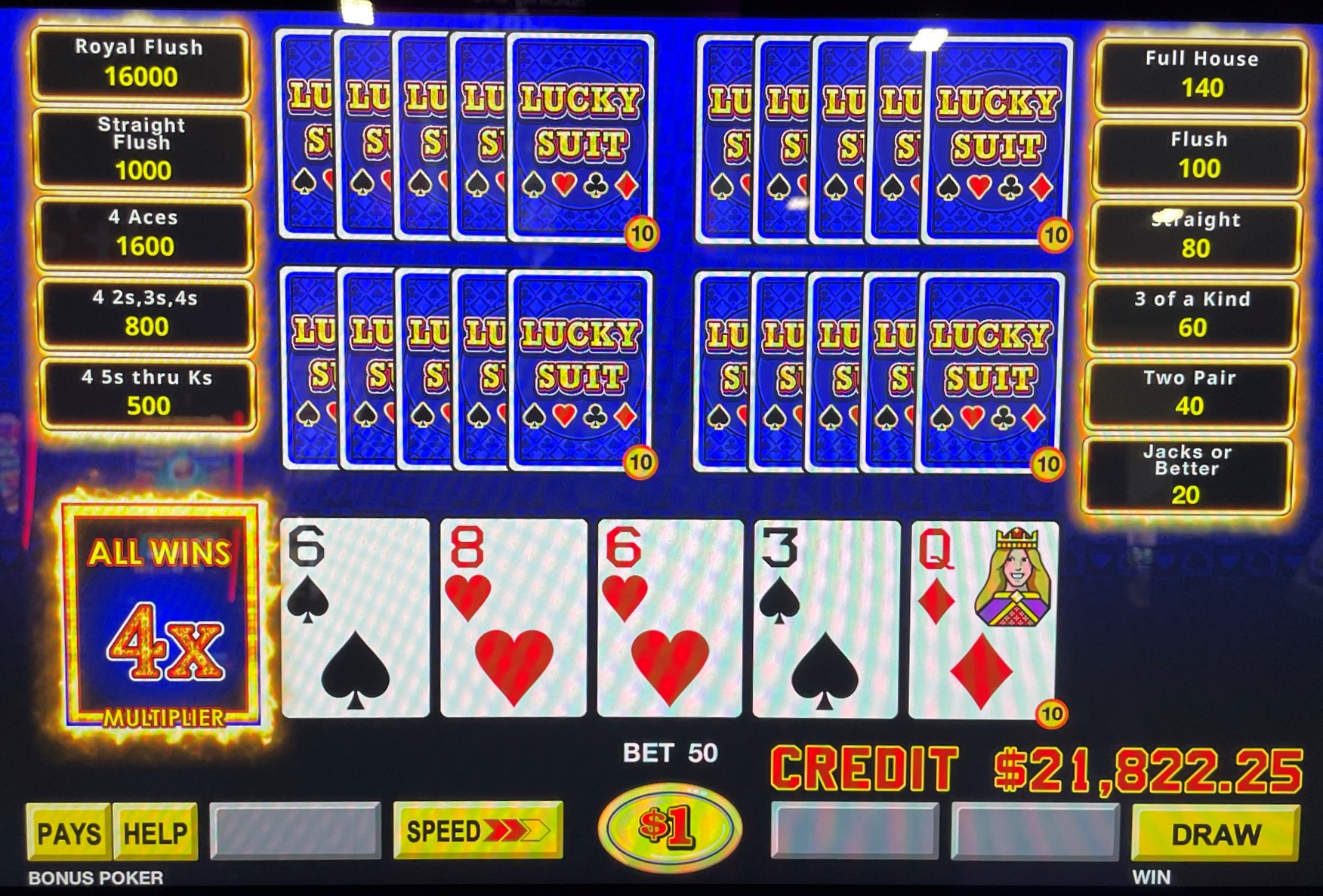 幸運花色是視訊撲克的變體,如果發出的第一張牌與「幸運花色」匹配,則會獎勵乘數。乘數取決於第一張牌的點數。