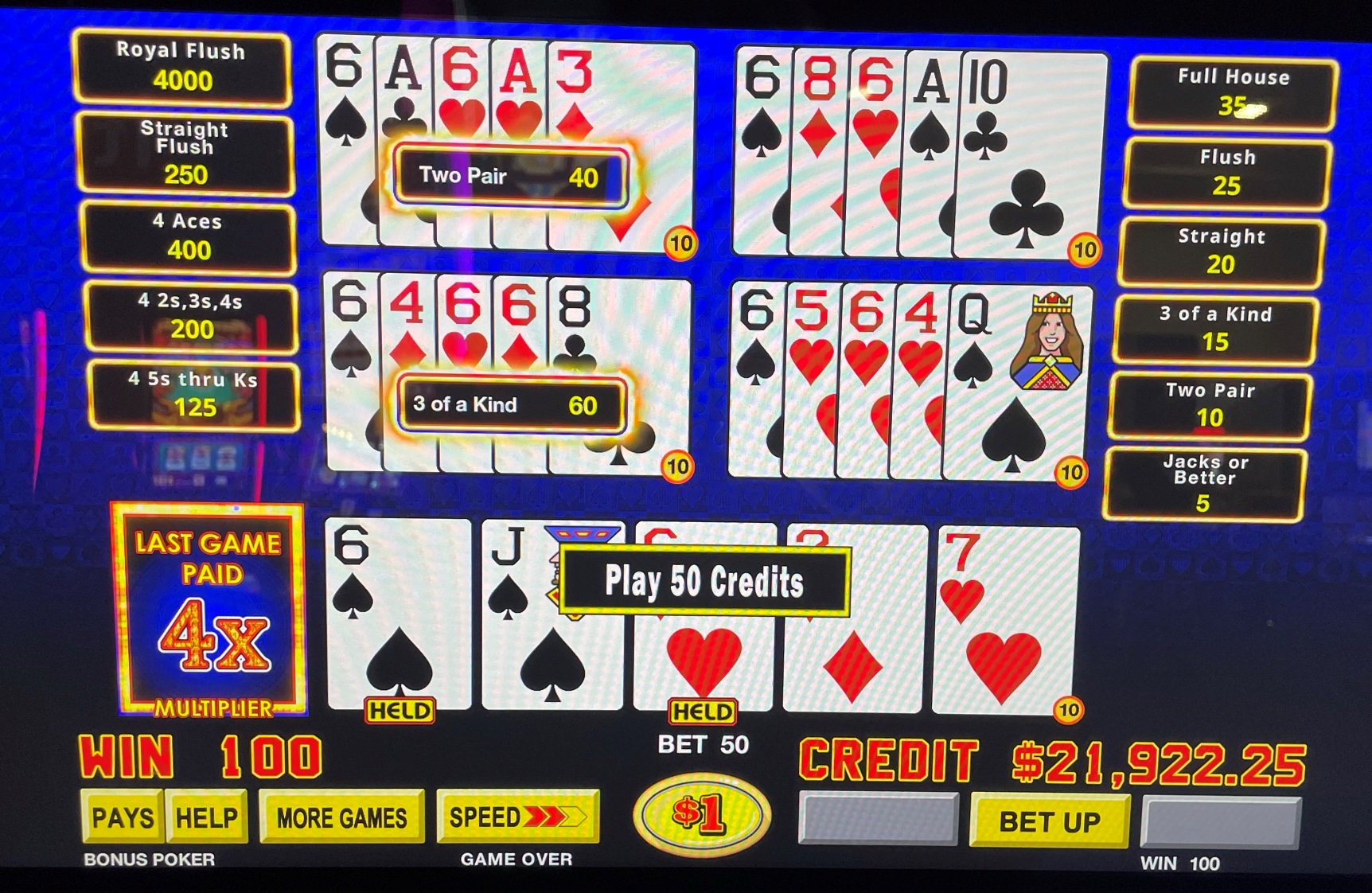 我拿到了一對六。注意,即使拿到黑桃六,也不需要保留乘數。一手牌升級為兩對,另一手牌升級為三條。通常情況下,這兩手牌分別贏得 10 張和 15 張籌碼。但是,由於乘數為 4 倍,我的總獎金為 4×(10+15) = 100。