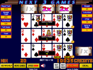我的高對子有一手牌升級成了兩對。基於1倍乘數、每線下注5個硬幣、高對子基本贏利1分、兩對子基本贏利2分,總贏利為1×5×(2×1 + 1×2)= 20。