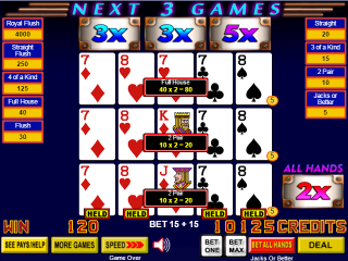 我的兩對有一手牌變成了葫蘆。基於2倍乘數、每線下注5個硬幣、兩對的基本贏利2分、葫蘆的基本贏利8分,總贏利為2×5×(2×2 + 1×8)= 120。
