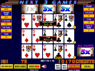 我的垃圾牌升級成了一張高對和一張兩對。基於5倍乘數、每線下注5個硬幣、兩對基本贏利2倍、高對基本贏利1倍的計算,總贏利為5×5× (1×1 + 1×2) = 75。