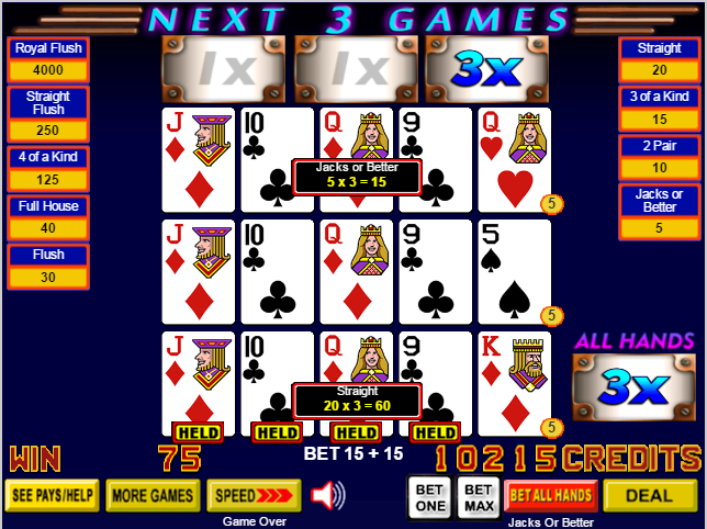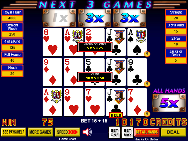 我的順子升級為一對高牌和一對順子。基於3倍乘數、每線下注5個硬幣、順子基本贏利4分、高對基本贏利1分,總贏利為3×5×(1×1 + 1×4)= 75。