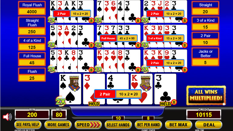 在上圖中,發牌後立即獲得了2倍的乘數。抽牌後,我拿到了四張兩對、一張三條和一張葫蘆。在乘數之前,這些牌的賠率分別為10、15和45。因此,我這手牌的總賠率為2*(4*10 + 15 + 45) = 200。