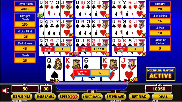 在上圖中,我開牌後贏得了兩個乘數。一個是左上角的3倍,這是一手輸牌,所以沒什麼用。另一個是中間列上從上往下數第三行的7倍乘數。這手牌是J或更好的牌,通常賠率為5。我還拿到了另外三手J或更好的牌,但沒能贏得乘數。因此,我的總獎金為7*5 + 3*5 = 35 + 15 = 50個籌碼。