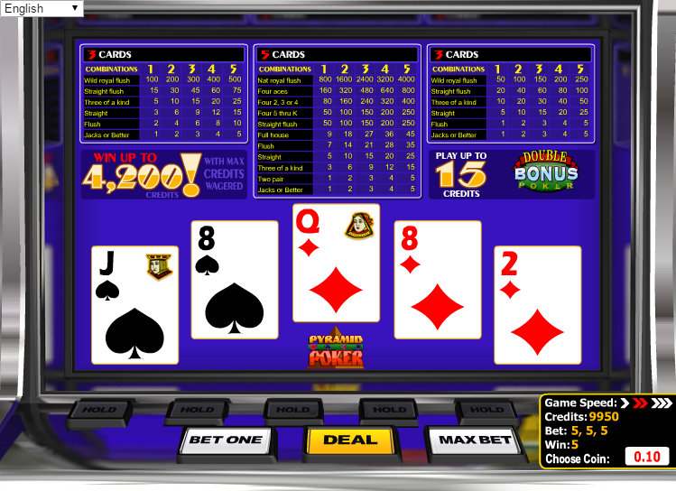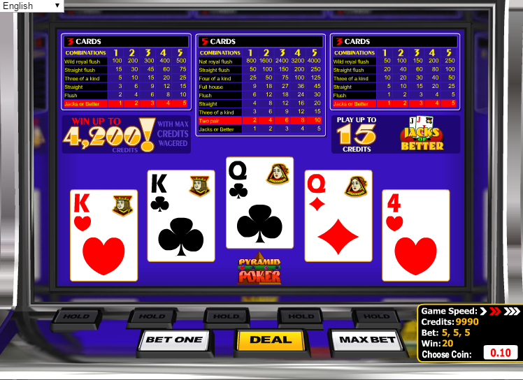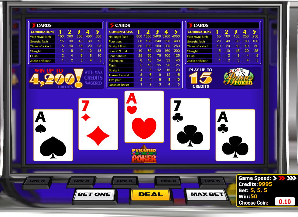 金字塔紅利撲克 (Pyramid Bonus Poker) 是 BetSoft 推出的一款視訊撲克遊戲,賠償方式有三種:五張牌、左手三張牌和右手三張牌。如果您正在尋找一款策略性十足的視訊撲克遊戲,那麼這款遊戲再複雜不過了。