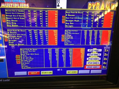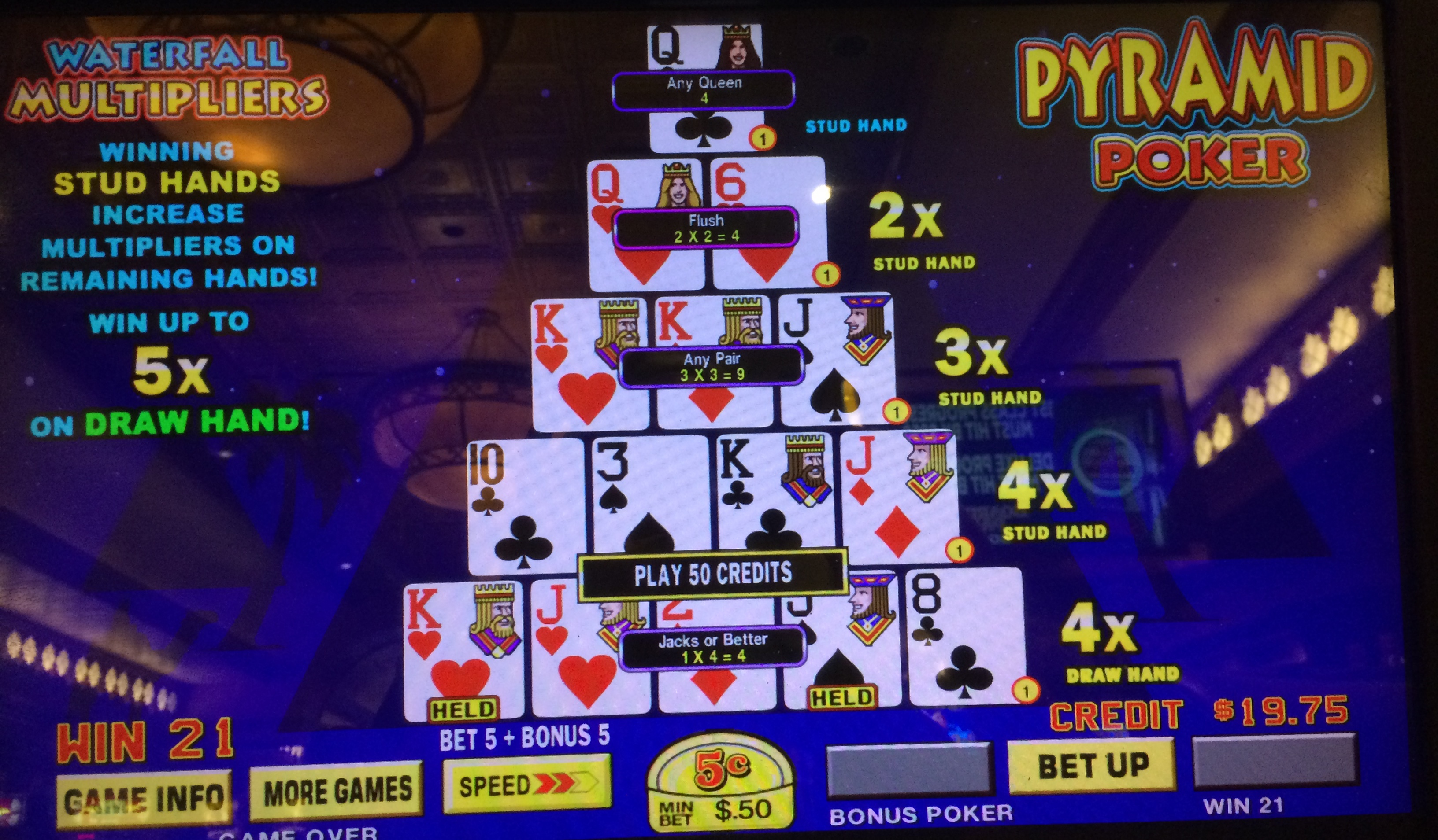 金字塔撲克是IGT推出的視訊撲克變體。它以五張牌的三角金字塔為底,玩法類似標準視訊撲克。頂部四個等級是隨機的,並根據公佈的賠率表支付點數和倍數。