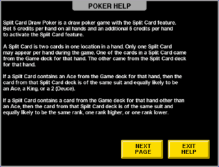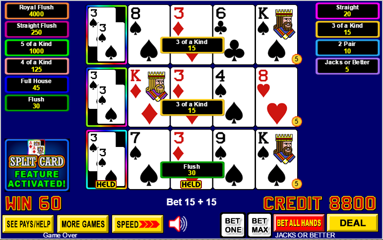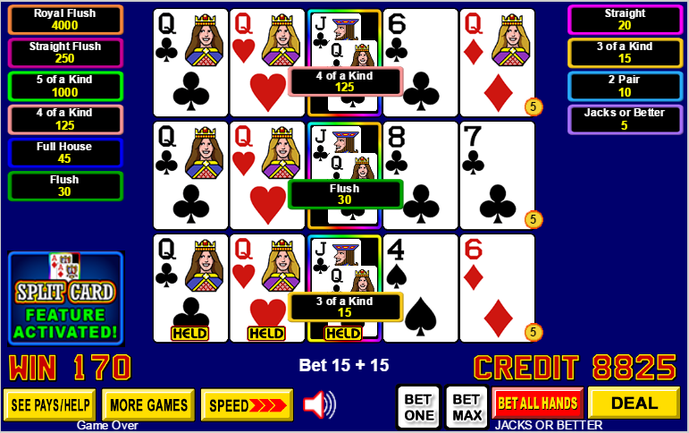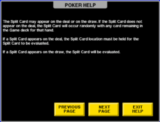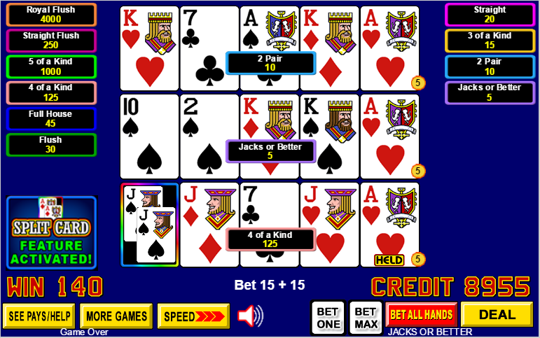 以下是我收到的分牌撲克遊戲和賠率表。不過,這些回報與傳統視訊撲克的回報相同。請耐心等待,我正在查詢分牌撲克的回報。 (更新日期:2015年12月2日)
