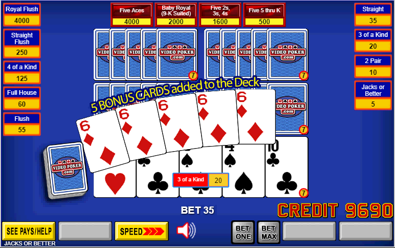 不,Stack the Deck Poker 不是用印有「堆疊」裸女圖案的牌玩的視訊撲克。它的要點是,如果玩家在多人玩撲克遊戲中每手牌額外支付兩枚硬幣,即可啟用一項功能,在特定情況下,在抽牌前向牌堆中添加所需的額外牌。例如,如果發牌時出現四張皇家牌,遊戲會在牌堆中增加五張完成皇家牌所需的牌。有關所有詳細信息,請參閱規則部分。