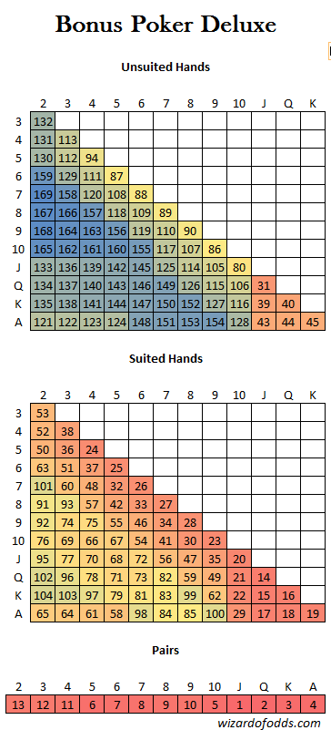 以下策略適用於包含以下賠率表的豪華紅利撲克遊戲。獎金以每枚硬幣計算,基於每手牌下註五枚硬幣。