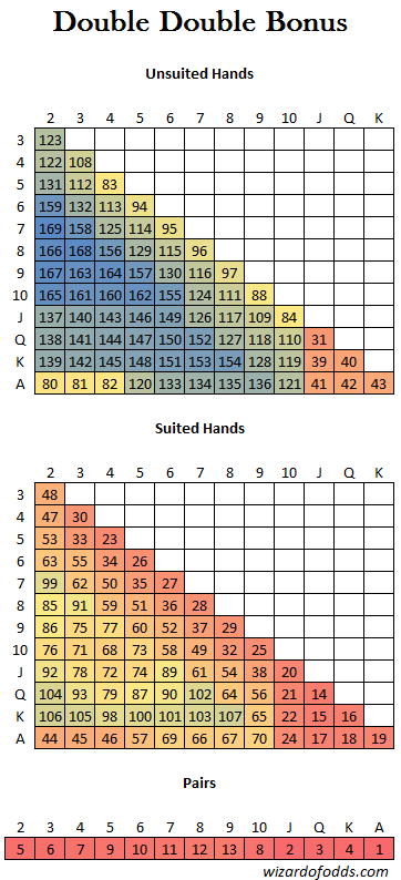 以下策略適用於雙倍雙倍獎金遊戲,賠率表如下。獎金以每枚硬幣計算,每手牌下註五枚硬幣。