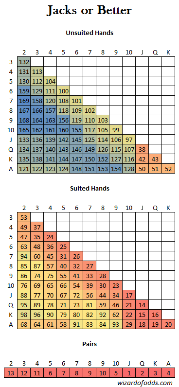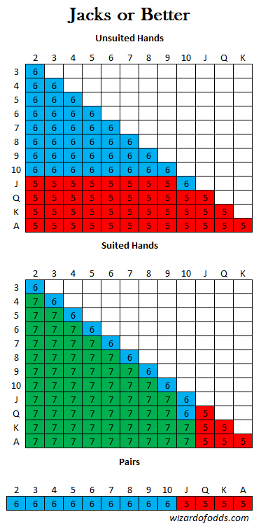 以下策略適用於「Jacks or Better」遊戲,賠率表如下。獎金以每枚硬幣計算,每手牌下註五枚硬幣。