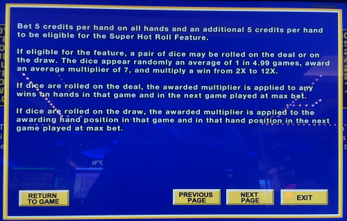 - Super Hot Roll 是 3 玩、5 玩和 10 玩視訊撲克的可選功能。