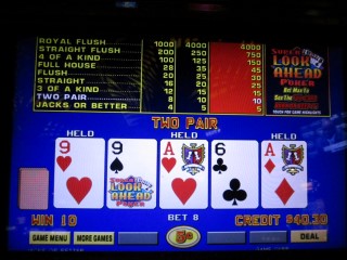 正如承諾的那樣,遊戲把第一張牌梅花4換成了黑桃9。可惜的是,下一張牌沒能湊成葫蘆,所以我拿到了兩對的賠率。