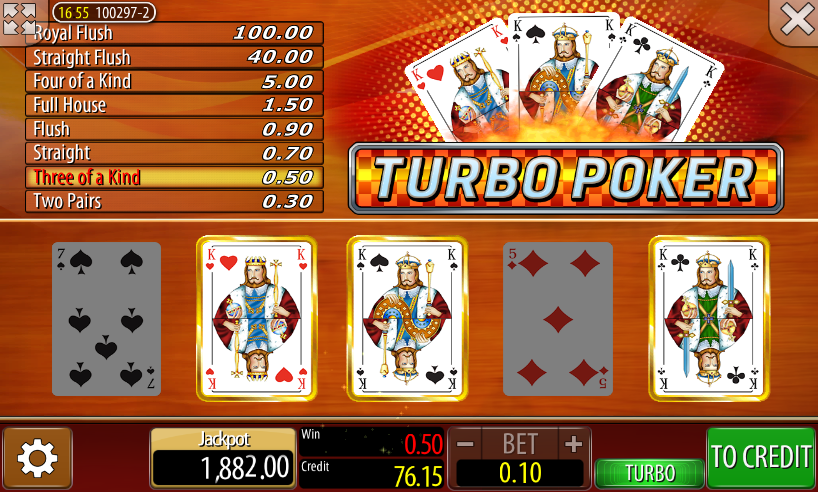 Turbo Poker 是一款 J 或更好的視訊撲克遊戲,採用德式規則,即發牌和換牌都要付費,他們稱之為“美式撲克”,但只在最後一手牌獲得賠付。我稱之為“德式規則”,是因為在德國的實體賭場中確實存在類似的視訊撲克遊戲,但它基於Joker Poker 。遊戲由Wazdan軟體公司開發。目前,使用該軟體的賭場均未獲得 Wizard of Odds 的認可,因此如果您選擇用真錢玩這款遊戲,則需要自行承擔風險。