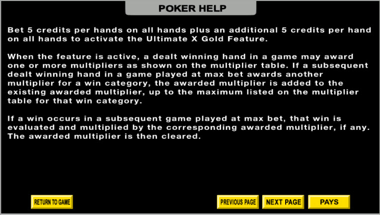 Ultimate X Gold 是 Action Gaming 推出的視訊撲克遊戲。它基於多玩視訊撲克,特別是 3 玩法、5 玩法或 10 玩法。如果玩家每手牌在通常的 5 個硬幣最高投注額之外額外下注 5 個硬幣,即可啟用乘數功能。與傳統的 Ultimate X 不同,乘數適用於所有手牌,但僅適用於特定贏利,並且有效期至使用為止。