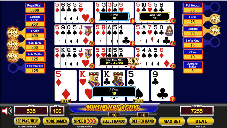 以下是典型的乘數表。此表適用於5次玩法的紅利撲克。