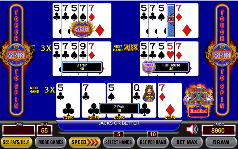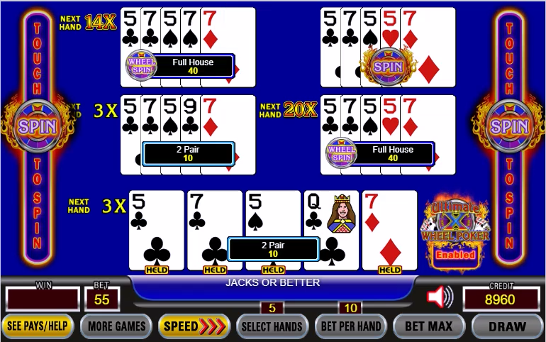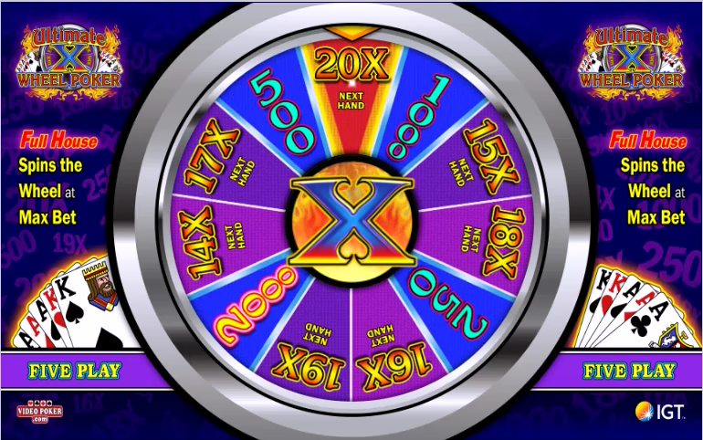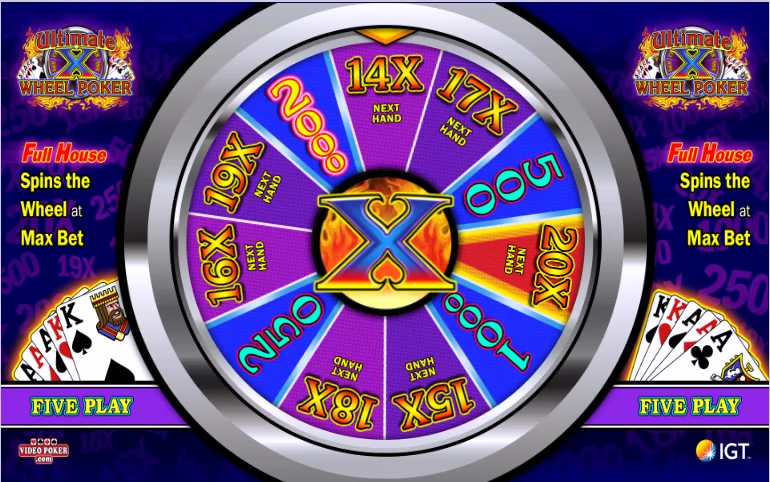Ultimate X 輪盤撲克與多線 Ultimate X輪盤撲克相同,不同之處在於玩家可以額外下注 5 個籌碼(總計,而非每次下注),以替換在非百搭牌遊戲中,抽獎時獲得葫蘆的乘數,並贏得獎勵輪盤。在 Deuces Wild 遊戲中,同花順將贏得獎勵輪盤。此獎勵輪盤提供高額乘數和即時獎金。