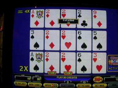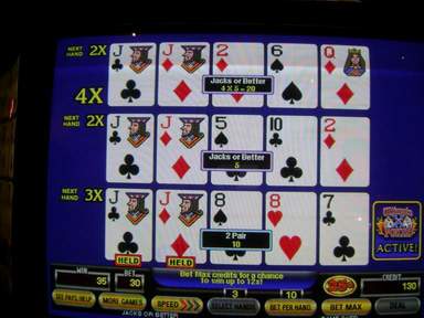 下圖顯示的是下一手牌。在上手牌中,我拿到了一對J。通常情況下,這筆錢會賠付5個硬幣,但4倍的倍數將賠付提升到了20個硬幣。中間和下面的牌沒有倍數,但下一手牌我獲得了倍數(上手牌和中間牌是2倍,下手牌是3倍),因為我下注了最大的30個硬幣。