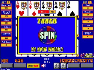 獎金包含一個旋轉的輪盤,它會停在視頻撲克牌局的11種可能的起手牌之一上。玩家將打出該手牌,並根據結果和特殊的獎金支付表獲得賠償。