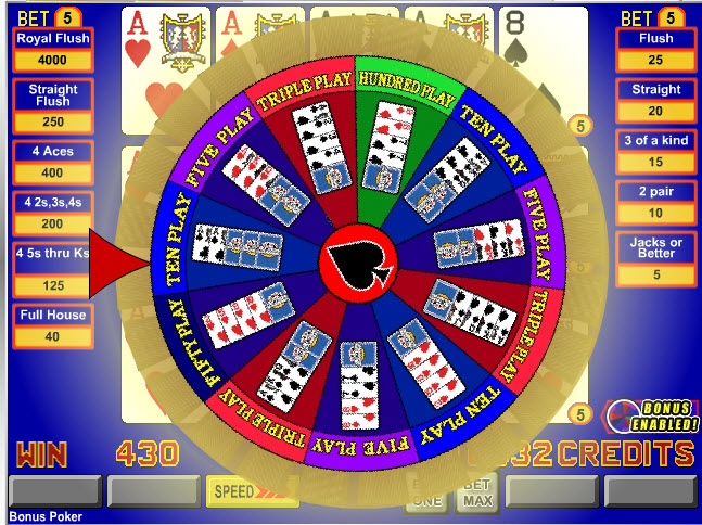 獎金包含一個旋轉的輪盤,它會停在視頻撲克牌局的11種可能的起手牌之一上。玩家將打出該手牌,並根據結果和特殊的獎金支付表獲得賠償。