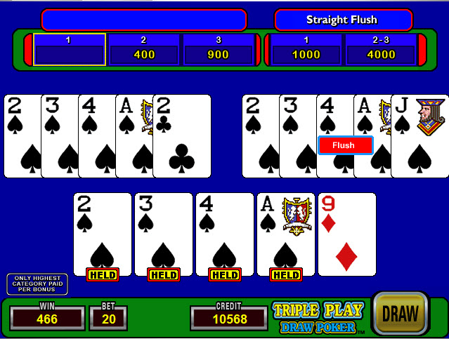 無需決定保留哪張牌;選擇是自動的。頂部的表格顯示了可能的贏獎金額。請注意左下角的標註框,上面寫著「每次獎金僅支付最高類別」。