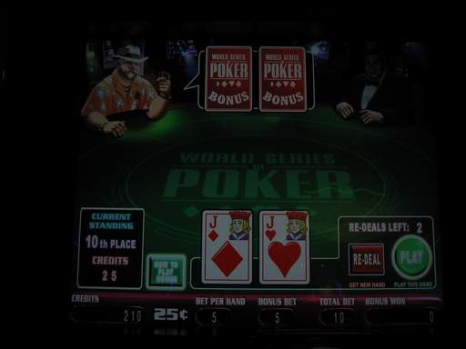世界撲克系列賽(副標題為「決賽桌獎金」)是WMS推出的視訊撲克遊戲。我在拉斯維加斯和勞克林的巴利賭場、凱撒宮和哈拉斯賭場都看過這款遊戲。遊戲玩法與普通視訊撲克類似,只是玩家可以額外下注以獲得「決賽桌獎金」。具體規則如下。