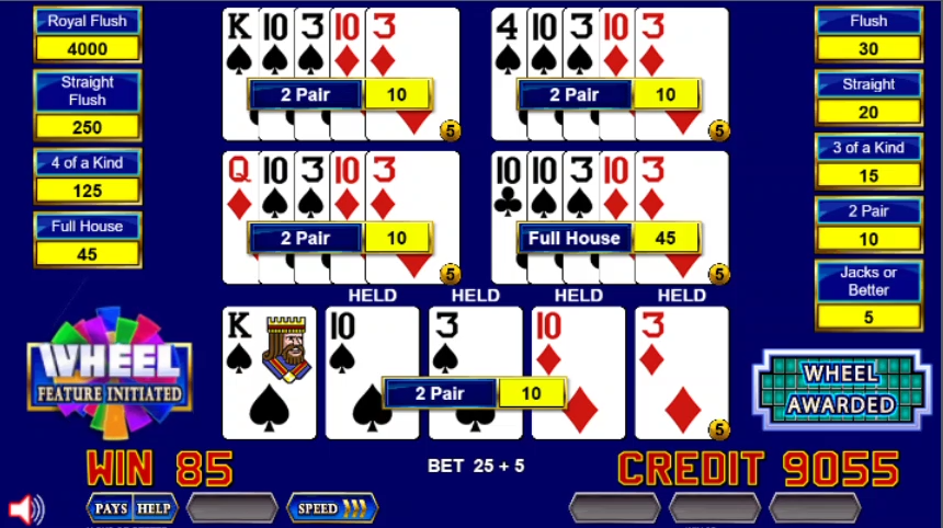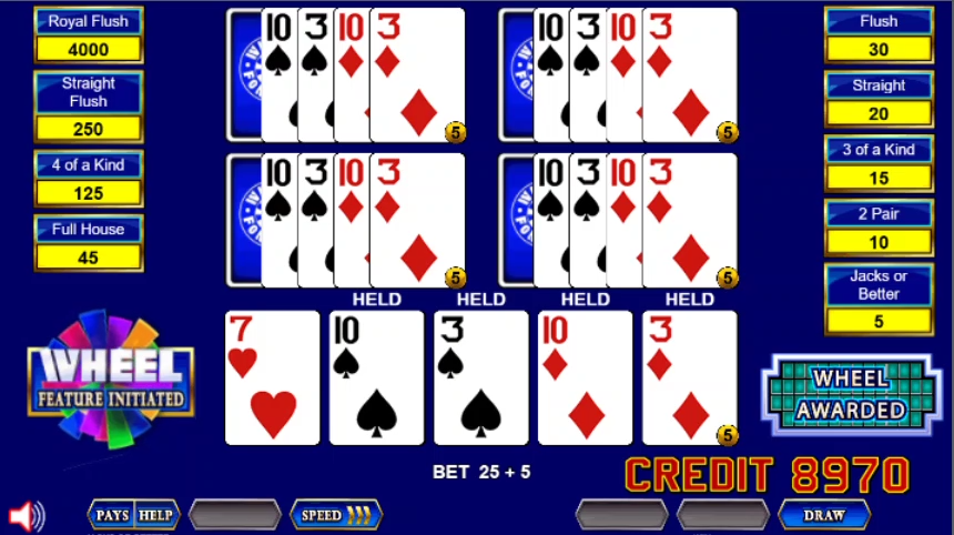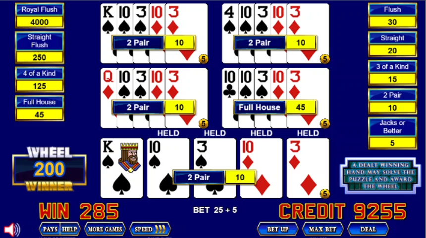- 此外,如果玩家額外下注 5 個積分,那麼發出的同花大順每次遊戲將支付 10,000 個積分,而不是通常的 4,000 個積分。