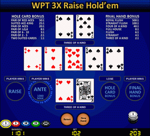 世界撲克巡迴賽全押德州撲克是一款基於撲克的桌面遊戲,在拉斯維加斯的米高梅/幻影賭場隨處可見。遊戲有兩個版本,名稱相同。其中一個版本中,玩家可以加註至底注的3倍,另一個版本中,玩家可以加註至底注的10倍。在本頁面介紹的版本中,玩家可以加註至底注的3倍。另一個10倍版本,請參閱世界撲克巡迴賽10倍加註德州撲克。此遊戲規則與真實撲克非常相似,風險因素僅0.196%。