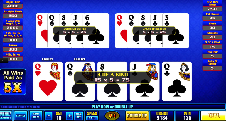 - 如果玩家每次下注 1 到 5 個積分,那麼遊戲將像傳統的視訊撲克一樣進行。