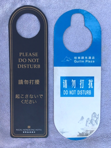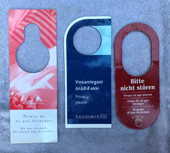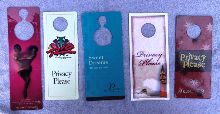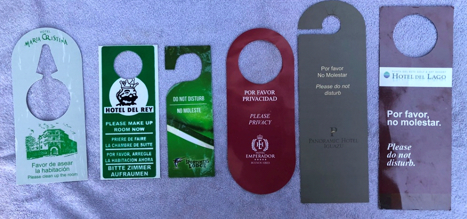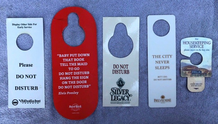 我收藏的眾多物品之一是飯店的「請勿打擾」標誌。標誌必須標明特定酒店的名稱才能被添加到收藏中。換句話說,不能是那種可以掛在任何飯店門上的通用標誌,也不能是那種只標明大品牌而不標明具體飯店的標誌。另一個要求是,我必須住過這家飯店。