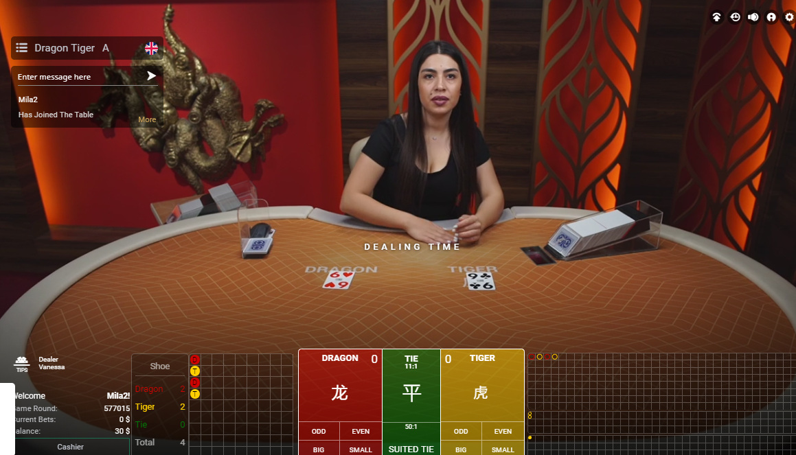 eBet 的龍虎遊戲畫面精美,還有魅力十足的亞洲荷官。可惜的是,他們平手的賠率只有 8 比 1,有點小氣。