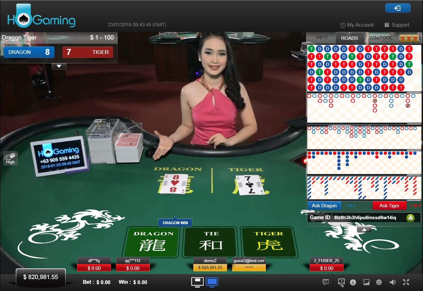 Ho Gaming提供龍虎遊戲,荷官來自他們菲律賓的工作室,非常熱情友善。他們提供大型統計數據顯示,並提供三種主要投注方式。我看不出他們平手的賠率是多少。