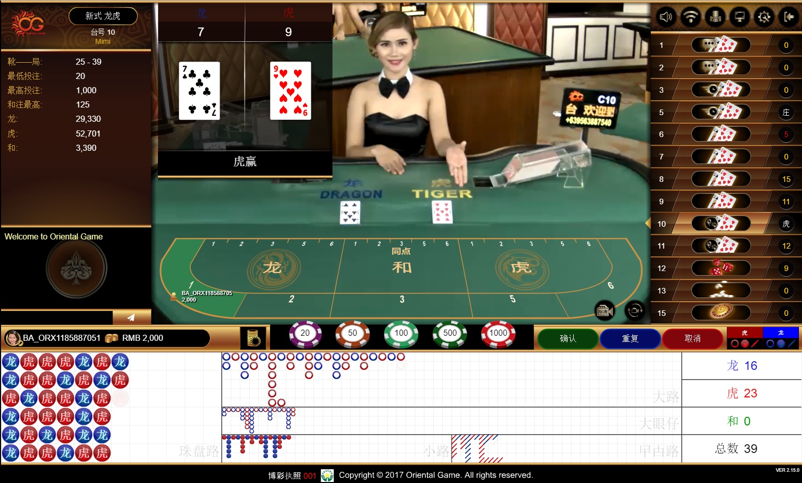 東方遊戲(Oriental Game)的龍虎鬥遊戲很簡單,只有三種主要投注方式。這家工作室我最喜歡的是荷官的服裝。賭桌是中文的,所以我看不出和局的賠率是多少。