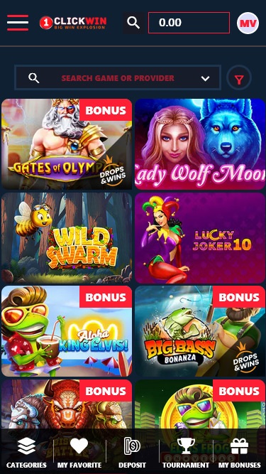 1ClickWin 賭場的營運商致力於為客戶提供業界最優質的遊戲。如果您決定在這裡遊戲,您將能夠訪問並暢玩由業內頂尖公司打造的線上老虎機遊戲,例如 BF Games、BGaming、 Pragmatic Play 、Endorphina、Spinomenal 等等。