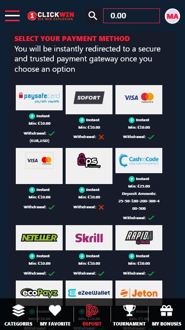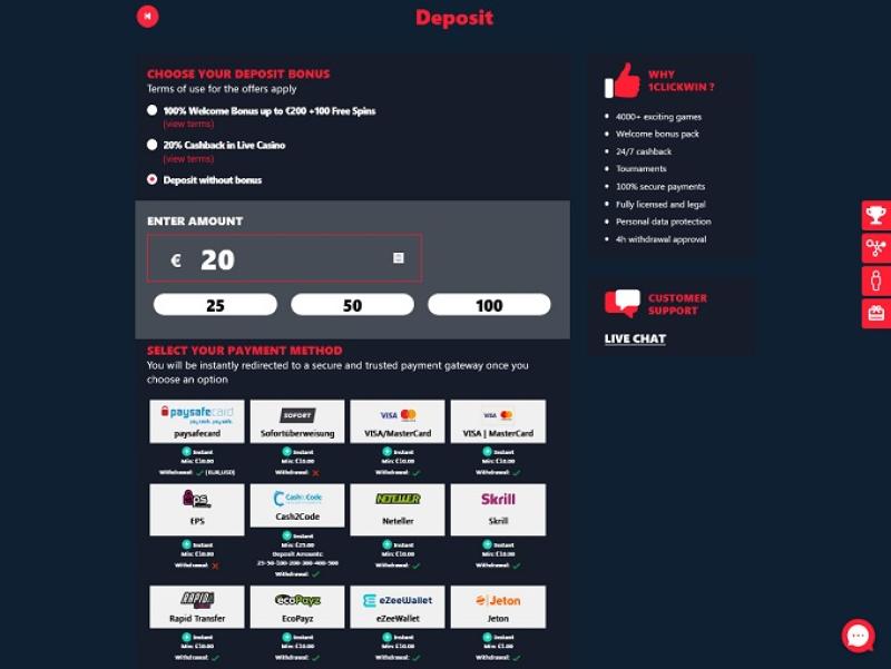 至於支付方式,1ClickWin Casino 確保玩家可以透過多種管道存款,例如 Visa、MasterCard、Trustly、Paysafecard、Neteller、Skrill 等等。除了標準存款選項外,對於喜歡加密貨幣存款的用戶,還可以選擇使用加密貨幣存款。