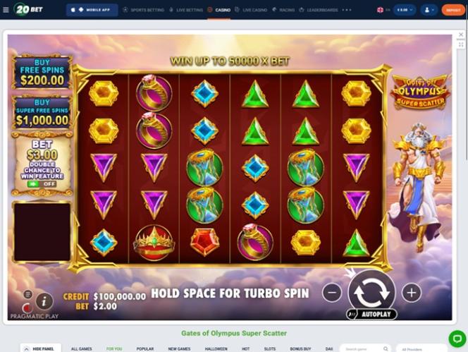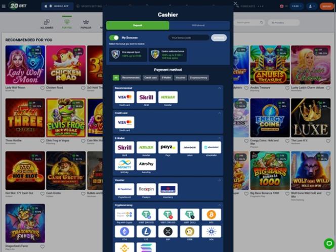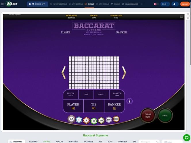 20Bet Casino 由 Microgaming, Net Entertainment, Playtech, BetSoft, 1x2gaming, Amatic Industries, Big Time Gaming, ELK Studios, Evolution Gaming, EYECON, Ezugi, Genesis Gaming, Novomatic, Oryx, Play'n GO, playson, Quickspin, Relax Gaming, Thunderkick, Yggdrasil, Endorphina, Wazdan, GameArt, Booming Games, Pragmatic Play, Nolimit City, Red Tiger Gaming, Booongo, LuckyStreak, Spinomenal, Felix Gaming, Red Rake Gaming, Skillzzgaming, Fugaso, Belatra Games, Fantasma Games, FunFair, Platipus Gaming, Skywind, Spinmatic, Spadegaming, Triple Edge Studios, BGAMING, Northern Lights Gaming, Evoplay, Stormcraft Studios, Switch Studios, OneTouch, Pocket Games Soft, All41 Studios, Gluck Games, Mascot Gaming, TVBet, NetGame Entertainment, Gameburger Studios, Slot Factory, Neon Valley Studios, Golden Rock Studios, Spearhead Studios, Swintt, TrueLab Games, SpinPlay Games, Mancala Gaming, Expanse Studios, 7Mojos, SmartSoft Gaming, KA Gaming, Real Dealer Studios, GONG Gaming, On Air Entertainment, Buck Stakes Entertainment, Caleta Gaming, Games Global, Amusnet Interactive, Ainsworth, Ash Gaming, CT Interactive, EveryMatrix, Greentube, Leander Games, Push Gaming, Tom Horn Gaming, Gamomat, Noble Gaming, BF Games, Bally Wulff, Old Skool Studios, Foxium, Just For The Win, Wild Streak Gaming, Slingshot Studios, Fortune Factory Studios, RubyPlay, AvatarUX, Gamevy, Crazy Tooth Studio, High 5 Games, ReelPlay, Alchemy Gaming, Rarestone Gaming, Indi Slots, Black Pudding Games, Snowborn Games, Boomerang Studios, Hacksaw Gaming, Max Win Gaming, Gold Coin Studios, Gamzix, Triple Cherry, Peter And Sons, Absolute Live Gaming, Aurum Signature Studios, Onlyplay, Gamebeat, Area Vegas, RAW iGaming, Bombay Live, Leap Gaming, TaDa Gaming, Winfinity, 3 Oaks Gaming, Amigo Gaming, Wishbone Games, Spribe, Circular Arrow, 1spin4win, Gaming Corps, BetSolutions, Nailed It! Games, Neko Games, Reel Kingdom, Oros Gaming, JVL, Indigo Magic, Popiplay, Live88, ICONIC21, Galaxsys, Penguin King and Octoplay提供支持,網站採用網頁介面,您可以使用互聯網瀏覽器存取。網站設計精良,導航便捷,設有體育博彩、賭場和真人荷官賭場等不同標籤頁。此外,網站還內建行動端支持,方便您在手機或平板電腦上暢玩。Baccarat