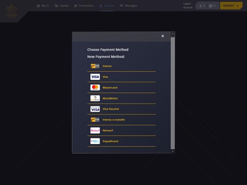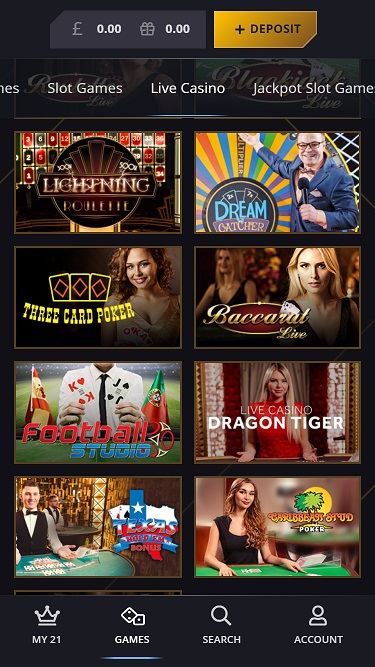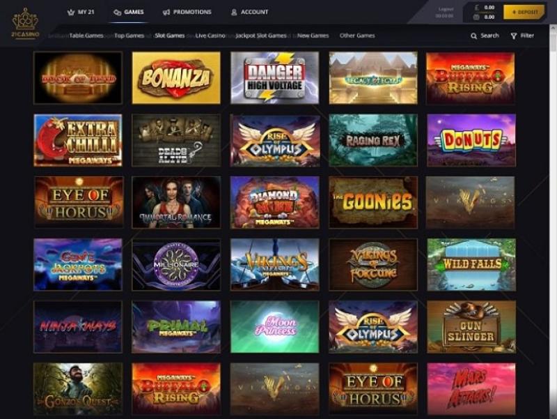 21 Casino 由 Microgaming, Net Entertainment, 1x2gaming, Barcrest, Big Time Gaming, ELK Studios, Evolution Gaming, EYECON, Ezugi, lightningboxgames, Novomatic, Oryx, Play'n GO, Rabcat, Relax Gaming, Thunderkick, Wazdan, Realistic Games, Booming Games, Stakelogic, Pragmatic Play, Nolimit City, Felt Gaming, Red Tiger Gaming, IGT, Spinomenal, Fantasma Games, SYNOT Games, Kalamba, Revolver Gaming, Skywind, Spinmatic, Triple Edge Studios, BGAMING, Northern Lights Gaming, Stormcraft Studios, Switch Studios, Electric Elephant Games, Pocket Games Soft, All41 Studios, Gameburger Studios, Pulse 8 Studios, Neon Valley Studios, Golden Rock Studios, Spearhead Studios, Swintt, Shuffle Master, SpinPlay Games, GONG Gaming, Blue Guru Games, Lady Luck Games, Buck Stakes Entertainment, Design Works Gaming, Games Global, 2by2 Gaming, Ainsworth, Bally Technologies, Blueprint Gaming, Endemol Games, Greentube, Leander Games, Merkur Gaming, NYX Interactive, Push Gaming, Tom Horn Gaming, WMS, Inspired Gaming, Gaming Realms, SG Interactive, Red7Mobile, CORE Gaming, Scientific Games, Side City Studios, Reel Time Gaming, Authentic Gaming, Iron Dog Studio, Old Skool Studios, Foxium, Betdigital, Just For The Win, Storm Gaming Technology, PearFiction Studios, Apollo Games, Wild Streak Gaming, Slingshot Studios, Fortune Factory Studios, Jade Rabbit Gaming, 4ThePlayer, AvatarUX, Gamevy, Crazy Tooth Studio, NetGaming, High 5 Games, ReelPlay, AGS Interactive, Alchemy Gaming, Plank Gaming, Black Pudding Games, Snowborn Games, Hacksaw Gaming, Max Win Gaming, Gold Coin Studios, Half Pixel Studios, SilverBack Gaming, Peter And Sons, Aurum Signature Studios, Armadillo Studios, Lucksome Gaming, Area Vegas, RAW iGaming, Leap Gaming, Wishbone Games, Spribe, Print Studios, Gaming Corps, HammerTime Games, Four Leaf Gaming, INO Games, Nailed It! Games, Live 5, Neko Games and Light & Wonder提供支持,賭場的遊戲透過基於網路的即時遊戲平台以及行動網站提供,可透過智慧型手機和平板電腦進行遊戲。