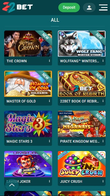 22Bet 由 Playtech, BetSoft, 1x2gaming, Amatic Industries, Espresso Games, Evolution Gaming, Ezugi, Genesis Gaming, Habanero Systems, HO Gaming, iSoftBet, Novomatic, Oryx, Play'n GO, playson, Quickspin, Rival, Saucify, SOFTSWISS, Thunderkick, Vivo Gaming, WM, Yggdrasil, Endorphina, Wazdan, Realistic Games, Arrows Edge, Booming Games, Gameplay Interactive, PlayPearls, Pragmatic Play, Nolimit City, Red Tiger Gaming, ZEUS Services, Booongo, LuckyStreak, Spinomenal, Felix Gaming, Red Rake Gaming, Inbet Games, Xprogaming, Fugaso, Belatra Games, SYNOT Games, Mobilots, Revolver Gaming, Platipus Gaming, Spinmatic, Spadegaming, BGAMING, Concept Gaming, Fazi, Evoplay, SA Gaming, OneTouch, Pocket Games Soft, Dreamtech Gaming, Triple PG, Gluck Games, Bunfox Games, CQ9 Gaming, Mascot Gaming, TVBet, NetGame Entertainment, Slot Factory, DLV, Radi8 Games, Spearhead Studios, Swintt, ThunderSpin, Super Spade Games, TrueLab Games, Mancala Gaming, 7Mojos, SmartSoft Gaming, KA Gaming, Atmosfera, FilsGame, Lady Luck Games, Holle Games, Caleta Gaming, Eurasian Gaming, Wizard Games, Ash Gaming, CT Interactive, EveryMatrix, Greentube, Igrosoft, omi-gaming, Pariplay, Tom Horn Gaming, Cayetano, Genii, Mr Slotty, Authentic Gaming, Top Trend Gaming, BF Games, betiXon, Capecod Gaming, Iron Dog Studio, Aspect Gaming, Apollo Games, Gamevy, NetGaming, High 5 Games, GMW, Groove Gaming, PlayStar, Rarestone Gaming, Vibra Gaming, Black Pudding Games, Hacksaw Gaming, Max Win Gaming, SimplePlay, Triple Cherry, Absolute Live Gaming, Charismatic, Onlyplay, FastSpin, Armadillo Studios, Gamebeat, FlipLuck, Playgon, Bombay Live, Leap Gaming, Betradar, GoldenRace, n2-LIVE, Winfinity, 3 Oaks Gaming, Spribe, BBIN, 1spin4win, JVL, Live88, Zillion Games, Playzia, Formula Spin, Bigpot Gaming, Pixmove Games, PlayAce, ABXplay and Turbo Games提供支持,您可以透過網路瀏覽器存取賭場平台,無需使用者下載軟體。該網站支援行動端遊戲,您可以使用智慧型手機和平板電腦試試運氣。
