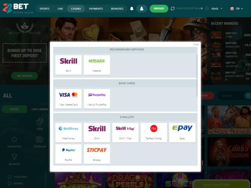 玩家抱怨22Bet賭場的付款速度慢,網站修復問題時的客服服務也很糟糕。因此,我建議您在這家賭場玩的時候務必謹慎。
