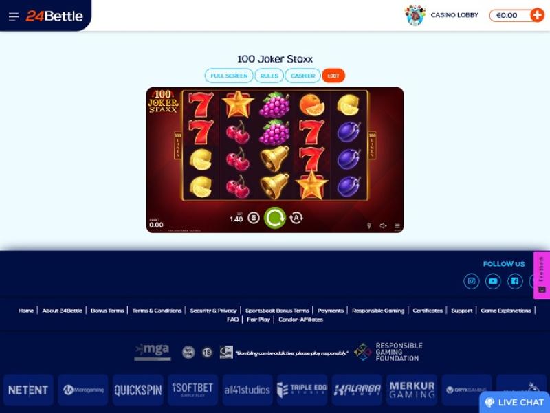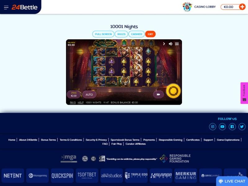 24Bettle Casino 由 Microgaming, Net Entertainment, BetSoft, Big Time Gaming, ELK Studios, Evolution Gaming, Genesis Gaming, Habanero Systems, iSoftBet, Oryx, Play'n GO, Quickspin, Rabcat, Relax Gaming, Thunderkick, Wazdan, Realistic Games, Booming Games, Pragmatic Play, Nolimit City, Red Tiger Gaming, Red Rake Gaming, Skillzzgaming, Fantasma Games, Kalamba, Triple Edge Studios, Northern Lights Gaming, Stormcraft Studios, Switch Studios, OneTouch, Electric Elephant Games, All41 Studios, Gluck Games, Gameburger Studios, Neon Valley Studios, Golden Rock Studios, SpinPlay Games, 7Mojos, Blue Guru Games, Games Global, 2by2 Gaming, bluberi, Merkur Gaming, Tom Horn Gaming, Gamomat, Foxium, Zitro, Just For The Win, Storm Gaming Technology, Wild Streak Gaming, Slingshot Studios, Golden Hero, Fortune Factory Studios, STHLM Gaming, 4ThePlayer, Gamevy, Crazy Tooth Studio, Japan Technicals Games, Alchemy Gaming, Plank Gaming, Snowborn Games, Hacksaw Gaming, Max Win Gaming, Gold Coin Studios, Half Pixel Studios, SilverBack Gaming, Peter And Sons, Eurostar Studios, Aurum Signature Studios, Bombay Live, Leap Gaming, Kiron, Print Studios, Four Leaf Gaming, Atomic Slot Lab and Live88提供支持,其遊戲透過基於網路的平台以及可讓您透過智慧型手機和平板電腦玩遊戲的行動網站提供。