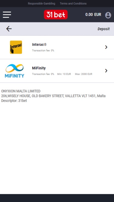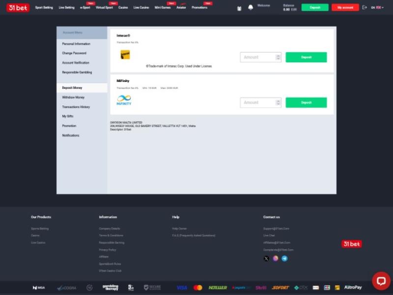 31bet Casino 提供傳統支付方式,例如信用卡和金融卡、電子錢包、電匯和其他網路銀行系統,但不支援加密貨幣和透過加密錢包付款。