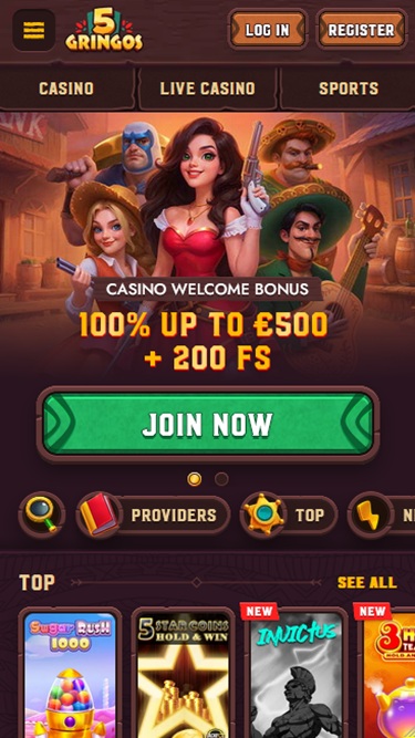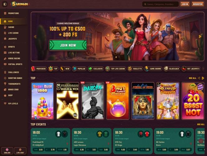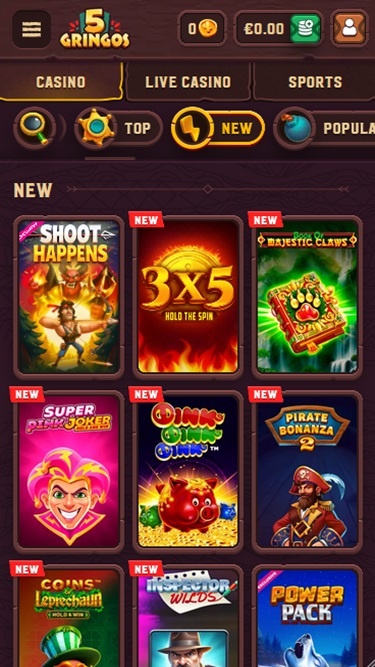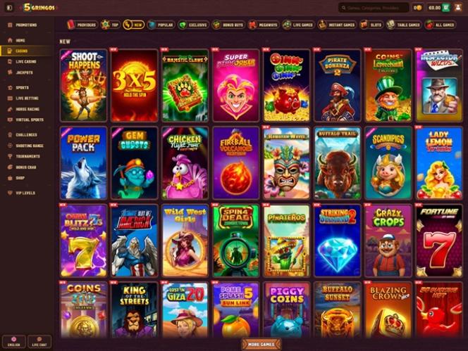 5Gringos 賭場由 Microgaming, Net Entertainment, Playtech, BetSoft, 1x2gaming, Amatic Industries, Big Time Gaming, ELK Studios, Evolution Gaming, EYECON, Ezugi, Habanero Systems, Novomatic, Oryx, Play'n GO, playson, Quickspin, Relax Gaming, Thunderkick, Yggdrasil, Endorphina, Wazdan, GameArt, Betgames, Booming Games, PlayPearls, Stakelogic, Pragmatic Play, Nolimit City, Felt Gaming, Red Tiger Gaming, Booongo, Spinomenal, Felix Gaming, Red Rake Gaming, Skillzzgaming, Fugaso, Fantasma Games, Kalamba, Revolver Gaming, Spin Games, Platipus Gaming, Skywind, Spinmatic, Triple Edge Studios, Northern Lights Gaming, Fazi, Evoplay, Stormcraft Studios, IGTech, OneTouch, Electric Elephant Games, Bulletproof Games, All41 Studios, Gluck Games, Mascot Gaming, Gameburger Studios, Pulse 8 Studios, Neon Valley Studios, Golden Rock Studios, Spearhead Studios, Swintt, Woohoo Games, SpinPlay Games, Mancala Gaming, HungryBear Gaming, SmartSoft Gaming, GONG Gaming, Blue Guru Games, Lady Luck Games, On Air Entertainment, Buck Stakes Entertainment, Caleta Gaming, Creedroomz, Games Global, Reevo, Amusnet Interactive, Wizard Games, bluberi, Blueprint Gaming, CT Interactive, EveryMatrix, Greentube, Leander Games, Merkur Gaming, NeoGames, Pariplay, Tom Horn Gaming, Cayetano, Gamomat, Reel Time Gaming, BF Games, Bally Wulff, Iron Dog Studio, Foxium, Zitro, Just For The Win, Reflex Gaming, Storm Gaming Technology, Apollo Games, Wild Streak Gaming, Slingshot Studios, Golden Hero, Fortune Factory Studios, Green Jade Games, RubyPlay, 4ThePlayer, AvatarUX, Gamevy, Crazy Tooth Studio, NetGaming, Groove Gaming, ReelPlay, SlotVision, Alchemy Gaming, Rarestone Gaming, Indi Slots, Vibra Gaming, Black Pudding Games, Snowborn Games, Boomerang Studios, Hacksaw Gaming, Max Win Gaming, Gold Coin Studios, Bang Bang Games, Gamzix, Half Pixel Studios, Arcadem, Slotmill, Peter And Sons, Aurum Signature Studios, Charismatic, Onlyplay, Armadillo Studios, Lucksome Gaming, Gamebeat, RAW iGaming, ELA Games, Bombay Live, Leap Gaming, Aviatrix, Kiron, TaDa Gaming, Winfinity, 3 Oaks Gaming, Amigo Gaming, Wishbone Games, Apparat Gaming, PopOK Gaming, Spribe, Circular Arrow, Print Studios, Gaming Corps, HammerTime Games, BetSolutions, Four Leaf Gaming, INO Games, Nailed It! Games, Atomic Slot Lab, Neko Games, Reel Kingdom, Oros Gaming, Givme Games, JVL, Indigo Magic, Zillion Games, ICONIC21, Clawbuster, VoltEnt, Kitsune Studios, InOut Games and Turbo Games提供支持,其遊戲透過網頁平台提供,可透過您的網路瀏覽器載入。網站設計精美,介面美觀,易於瀏覽。 5Gringos 還支援行動裝置遊戲,因此您可以根據需要在手機或平板電腦上進行博彩。