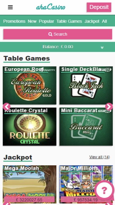 AhaCasino 由 Microgaming, Net Entertainment, BetSoft, Evolution Gaming, Ezugi, iSoftBet, Play'n GO, Yggdrasil, Endorphina, GameArt, Pragmatic Play, Games Global and NYX Interactive提供支持,賭場遊戲透過基於網頁的即時遊戲平台提供,可透過您的網頁瀏覽器載入。此外,AhaCasino 還支援行動端遊戲,玩家可以透過智慧型手機或平板電腦進行遊戲。