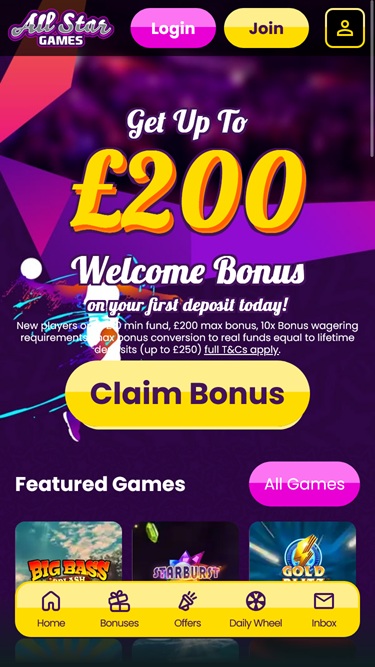 All Star Games 由 Microgaming, Net Entertainment, Playtech, 1x2gaming, Barcrest, Big Time Gaming, ELK Studios, EYECON, lightningboxgames, Oryx, Play'n GO, playson, Quickspin, Rabcat, Saucify, Thunderkick, Yggdrasil, Realistic Games, Booming Games, Pragmatic Play, Nolimit City, Red Tiger Gaming, Spinomenal, Red Rake Gaming, Fantasma Games, Spin Games, Skywind, Triple Edge Studios, Northern Lights Gaming, Fazi, Stormcraft Studios, Switch Studios, Bulletproof Games, All41 Studios, Gluck Games, Gameburger Studios, Pulse 8 Studios, Neon Valley Studios, Golden Rock Studios, Shuffle Master, SpinPlay Games, Real Dealer Studios, GONG Gaming, Blue Guru Games, On Air Entertainment, Buck Stakes Entertainment, Design Works Gaming, Games Global, 2by2 Gaming, Ainsworth, Ash Gaming, Bally Technologies, bluberi, Blueprint Gaming, Jumpman Gaming, Leander Games, Merkur Gaming, NextGen, Tom Horn Gaming, WMS, Inspired Gaming, Gaming Realms, Genii, SG Interactive, Gamomat, Red7Mobile, Scientific Games, Reel Time Gaming, Authentic Gaming, Iron Dog Studio, Old Skool Studios, Foxium, Betdigital, Just For The Win, The Games Company, Storm Gaming Technology, MetaGU, PearFiction Studios, Wild Streak Gaming, Slingshot Studios, Fortune Factory Studios, Jade Rabbit Gaming, 4ThePlayer, AvatarUX, Gamevy, Crazy Tooth Studio, High 5 Games, ReelPlay, Alchemy Gaming, Rarestone Gaming, Snowborn Games, Boomerang Studios, Hacksaw Gaming, Max Win Gaming, Gold Coin Studios, Half Pixel Studios, Peter And Sons, Aurum Signature Studios, Lucksome Gaming, Area Vegas, RAW iGaming, Wishbone Games, HammerTime Games, INO Games, Nailed It! Games, Atomic Slot Lab, Neko Games, Reel Kingdom and Light & Wonder提供支持,賭場遊戲透過基於網頁的即時遊戲平台提供,可直接透過您的網路瀏覽器載入遊戲。該網站還支援行動遊戲,您可以使用智慧型手機或平板電腦進行遊戲。