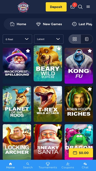 All Star Slots 由 Real Time Gaming, Visionary iGaming and Spinlogic Gaming獨家提供支持,為玩家提供各種桌上遊戲、老虎機、視訊撲克和特色遊戲。