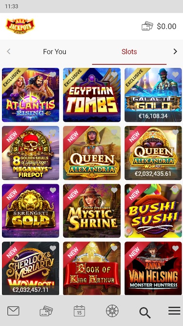 All Jackpots 賭場由 Microgaming, Net Entertainment, Evolution Gaming, Ezugi, Rabcat, Pragmatic Play, Red Tiger Gaming, Triple Edge Studios, Northern Lights Gaming, Stormcraft Studios, Switch Studios, Electric Elephant Games, All41 Studios, Gameburger Studios, Pulse 8 Studios, Neon Valley Studios, SpinPlay Games, Real Dealer Studios, GONG Gaming, On Air Entertainment, Buck Stakes Entertainment, Games Global, Foxium, Just For The Win, PearFiction Studios, Slingshot Studios, Fortune Factory Studios, Crazy Tooth Studio, Alchemy Gaming, Snowborn Games, Gold Coin Studios, Half Pixel Studios, Eurostar Studios and Aurum Signature Studios提供支持,賭場的網頁平台提供數百款遊戲。對於網路速度較慢的用戶,我們也提供可下載的賭場版本。賭場也提供一個不錯的行動網站,不過在行動裝置上遊戲內容較少。